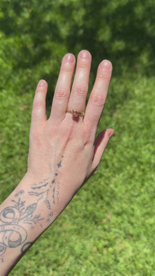 This band was handcarved by Georgia in our vegan studio and then cast locally using recycled australian gold before being finished by Geogia with a natural sunstone.